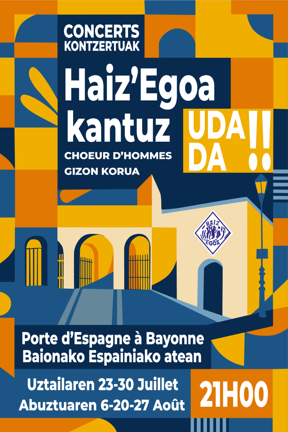 Ce projet consistait en la création d’une nouvelle affiche pour annoncer les concerts estivaux "UDA DA!" du chœur d’hommes Haiz’Egoa, se déroulant à la Porte d’Espagne à Bayonne.