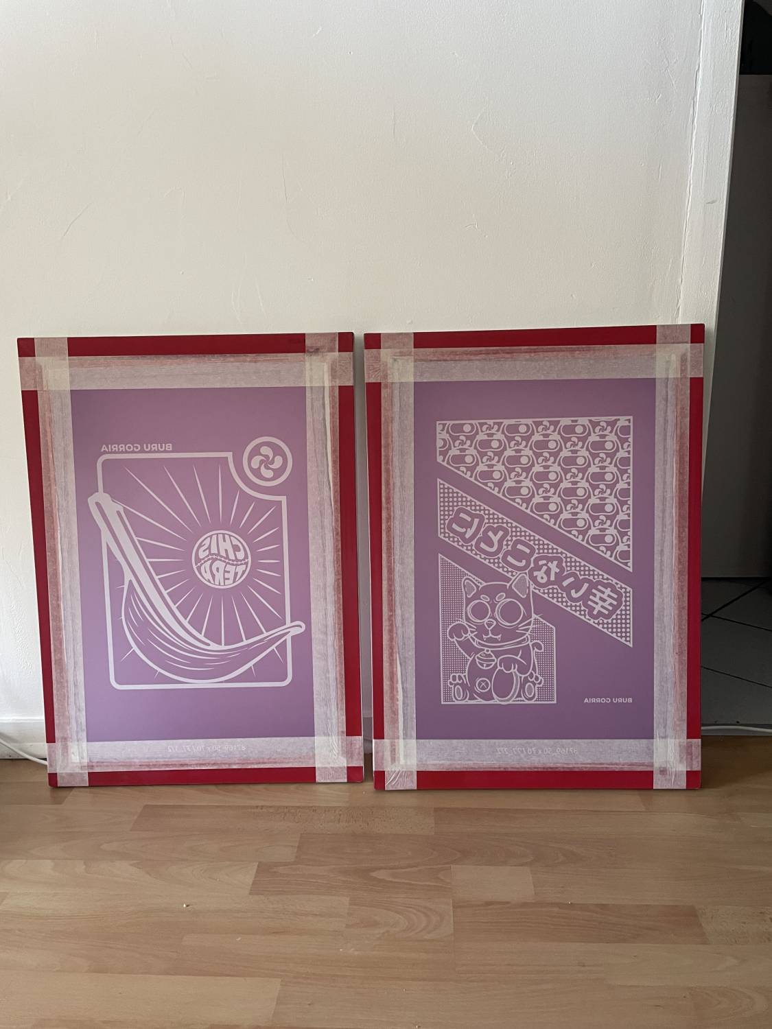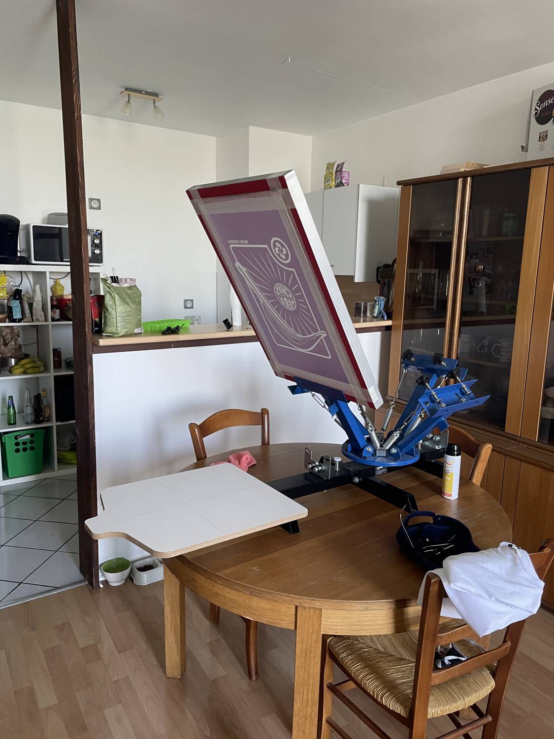 L’ensemble du processus, de la création graphique à la sérigraphie artisanale, a été réalisé à la maison. Cette première collection est pensée comme une série limitée, produite de manière locale, avec une volonté de proposer un produit chargé de sens, à la croisée du design, de la tradition et de l’expérimentation manuelle.