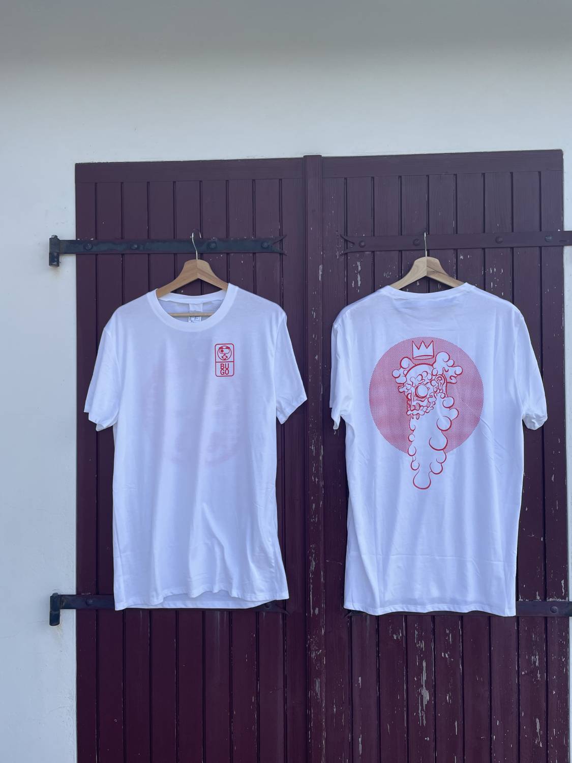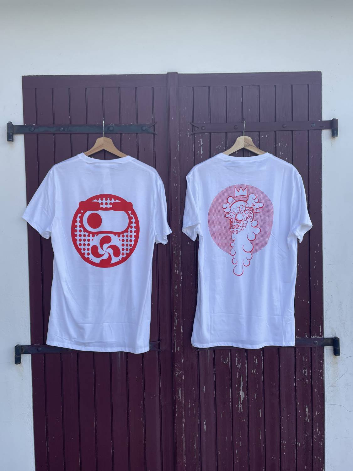 Deux visuels principaux ont été créés pour le dos des t-shirts, chacun représentant une version stylisée et expressive du Daruma, intégrant des éléments graphiques inspirés à la fois de l’iconographie japonaise et des motifs traditionnels basques. Le logo de la marque, plus minimaliste, est sérigraphié sur le cœur à l’avant du t-shirt. La palette rouge sur blanc reprend le code vestimentaire emblématique des fêtes de Bayonne, tout en renforçant la lisibilité et l’identité de la marque.